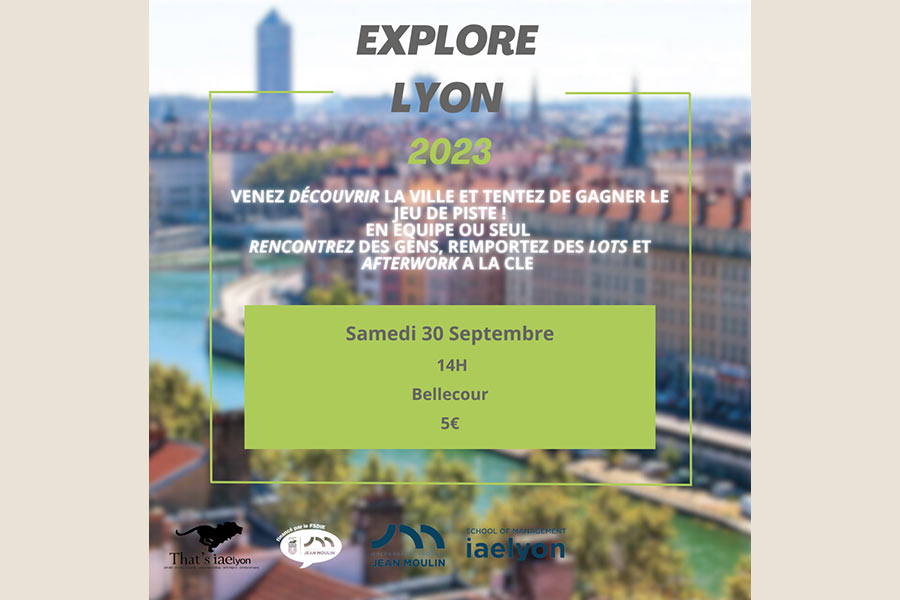 Le P?le International de l’association étudiante That’s iaelyon organise la 4ème édition d’Explore Lyon, un jeu de piste en équipe qui se tiendra samedi 30 septembre à partir de 14h au départ de Bellecour. Cet événement intégratif, festif et sportif réunira les étudiants internationaux et fran?ais nouvellement arrivés sur Lyon.