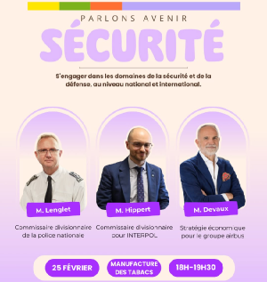Avec Monsieur LENGLET, Commissaire divisionnaire de la police nationale ; Monsieur HIPPERT, Commissaire divisionnaire pour INTERPOL ; et Monsieur DEVAUX, Stratège économique pour le groupe Airbus.